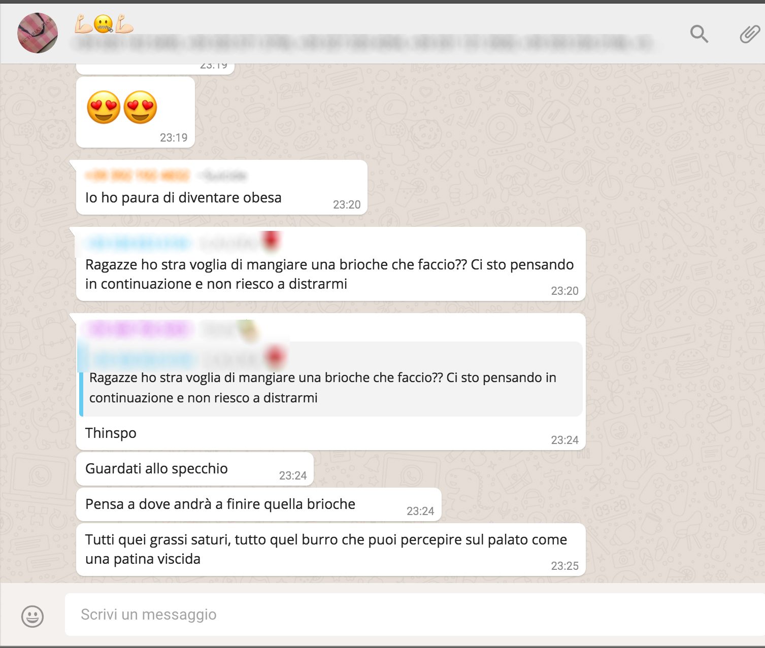 "Il mio record è sedici giorni senza mangiare" scrive una ragazza con una punta di orgoglio. "E non mangiavi nulla? Bevevi soltanto?" chiede con stupore un'altra. "Sì, solo the, infusi e acqua e limone. Io sapevo che può sopravvivere senza mangiare fino a 50 giorni". Questo è solo uno dei terribili messaggi che si possono trovare nelle ormai famose chat "pro Ana".