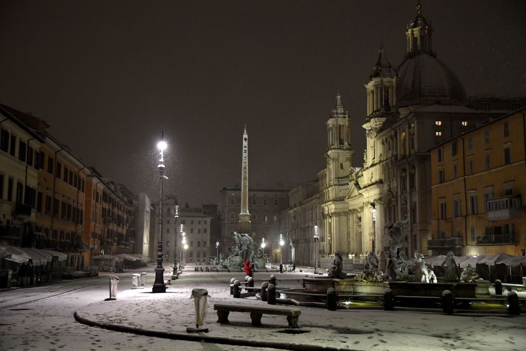 I moumenti più belli della Capitale sono completamente imbiancati, dal Colosseo alla Basilica di San Pietro. Ricoperte di neve anche le piazze storiche della Capitale, come piazza Navona e piazza Venezia.