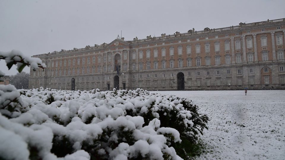 Si è presentata completamente imbiancata la  Reggia di Caserta, oggi dopo l'evento atmosferico che ha caratterizzato l'intero quadrante meridionale. Uno spettacolo particolarmente apprezzato da residenti e turisti che hanno immortalato con foto l'evento.