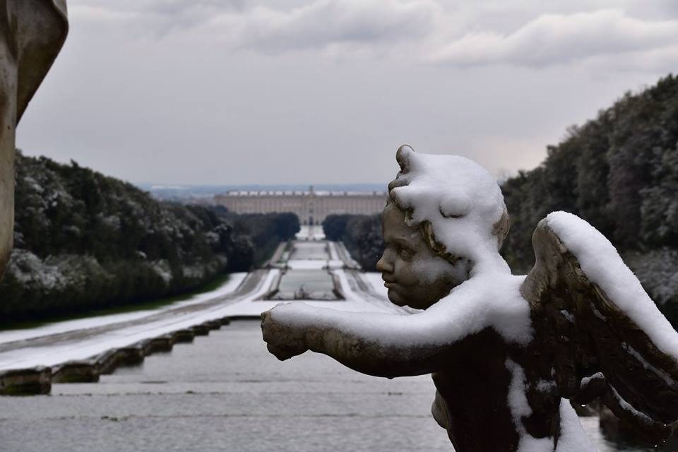Si è presentata completamente imbiancata la  Reggia di Caserta, oggi dopo l'evento atmosferico che ha caratterizzato l'intero quadrante meridionale. Uno spettacolo particolarmente apprezzato da residenti e turisti che hanno immortalato con foto l'evento.
