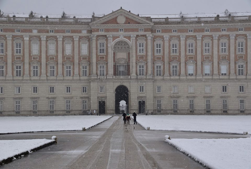 Si è presentata completamente imbiancata la  Reggia di Caserta, oggi dopo l'evento atmosferico che ha caratterizzato l'intero quadrante meridionale. Uno spettacolo particolarmente apprezzato da residenti e turisti che hanno immortalato con foto l'evento.