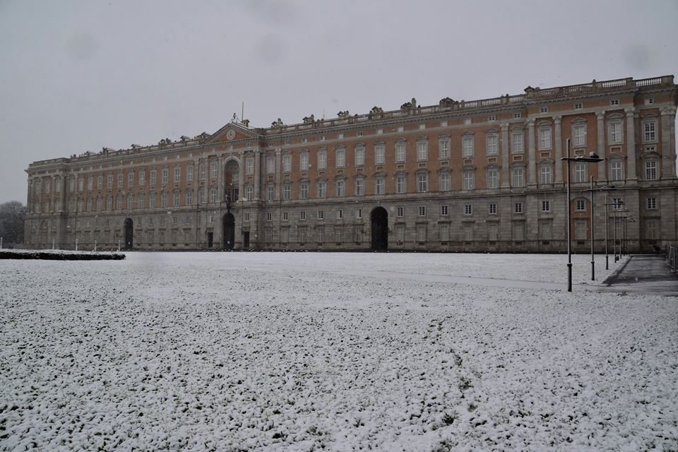 Si è presentata completamente imbiancata la  Reggia di Caserta, oggi dopo l'evento atmosferico che ha caratterizzato l'intero quadrante meridionale. Uno spettacolo particolarmente apprezzato da residenti e turisti che hanno immortalato con foto l'evento.
