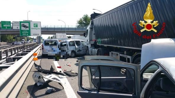 Un uomo è morto e 10 persone sono rimaste ferite oggi in un maxi-tamponamento lungo la tangenziale di A57, poco prima dello svincolo di Marghera, direzione Trieste. L'incidente ha coinvolto cinque auto e un mezzo pesante. A perdere la vita il conducente di una Mercedes classe A, che è stata tamponata e trascinata dal Tir.