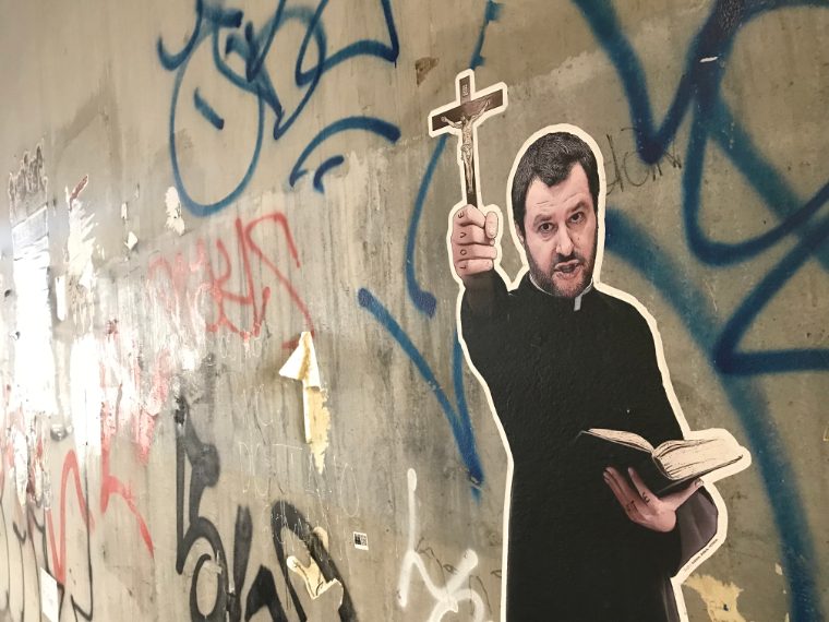 Roma, spunta il murales di Salvini vestito da prete e con il crocifisso in mano