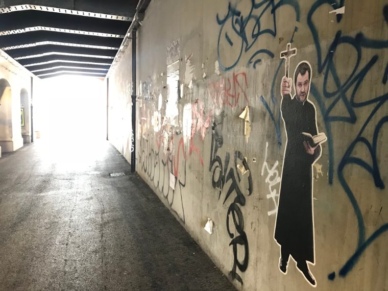 Roma, spunta il murales di Salvini vestito da prete e con il crocifisso in mano