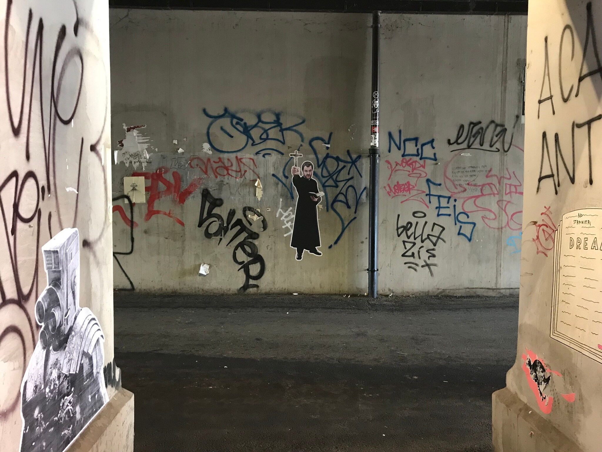 Roma, spunta il murales di Salvini vestito da prete e con il crocifisso in mano