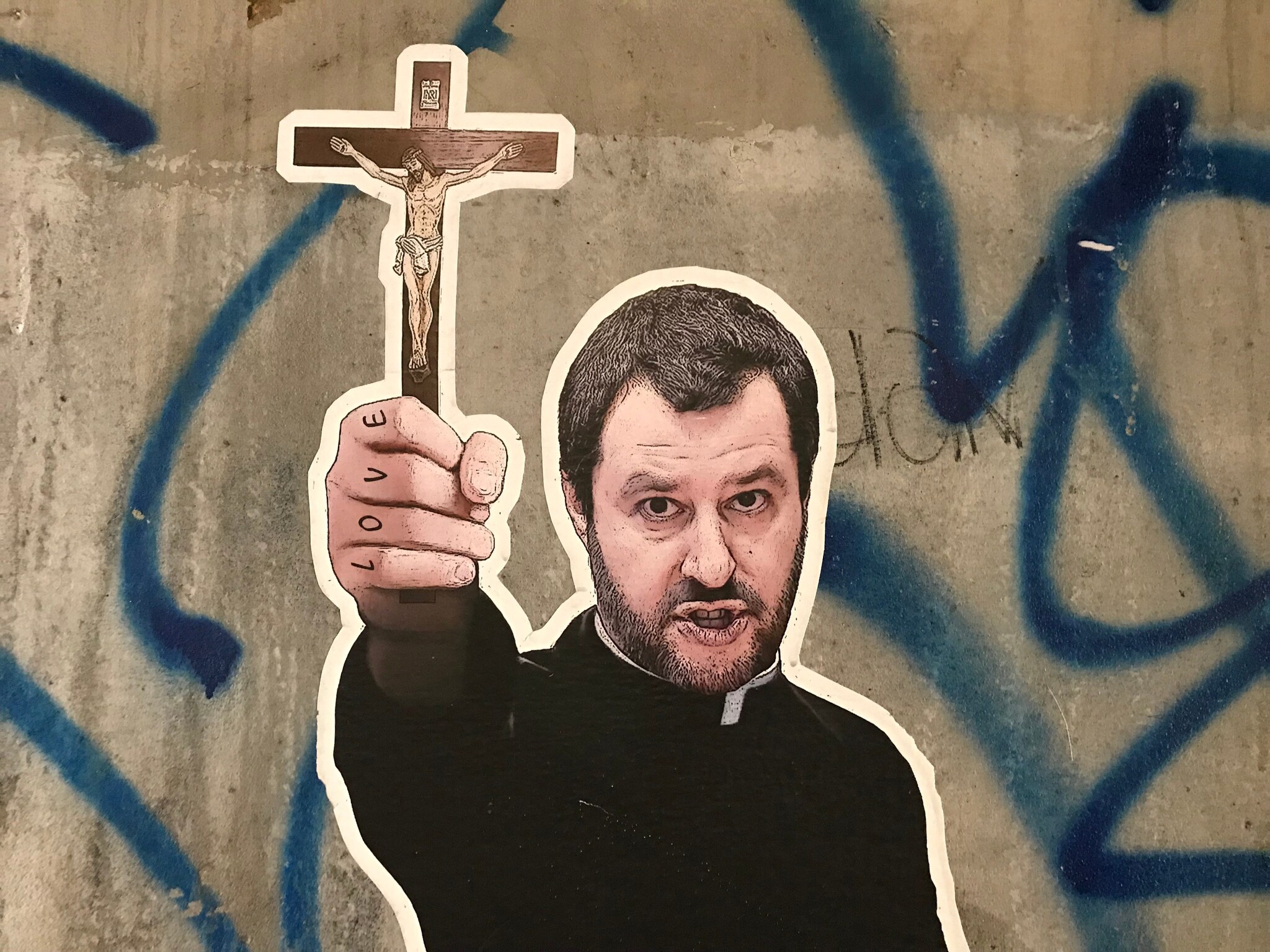 Roma, spunta il murales di Salvini vestito da prete e con il crocifisso in mano