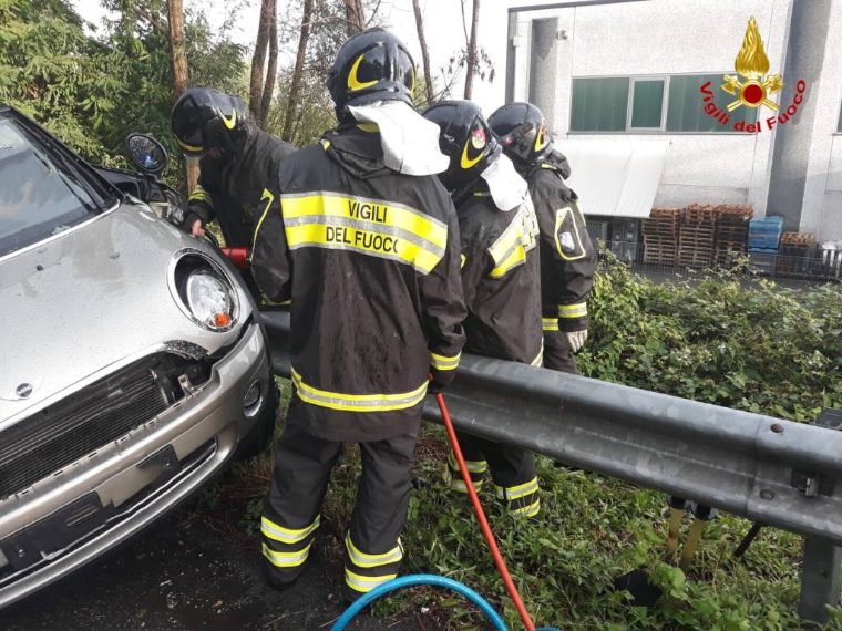 Incidente mortale a Gavirate, Varese, scontro frontale fra due automobili. Stando a quanto si apprende, sarebbe morta una donna. Fotografie dei vigili del fuoco.