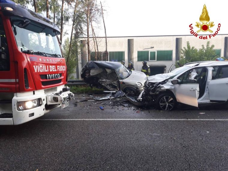 Incidente mortale a Gavirate, Varese, scontro frontale fra due automobili. Stando a quanto si apprende, sarebbe morta una donna. Fotografie dei vigili del fuoco.