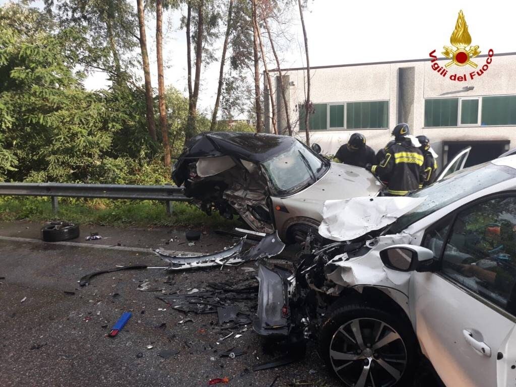 Incidente mortale a Gavirate, Varese, scontro frontale fra due automobili. Stando a quanto si apprende, sarebbe morta una donna. Fotografie dei vigili del fuoco.