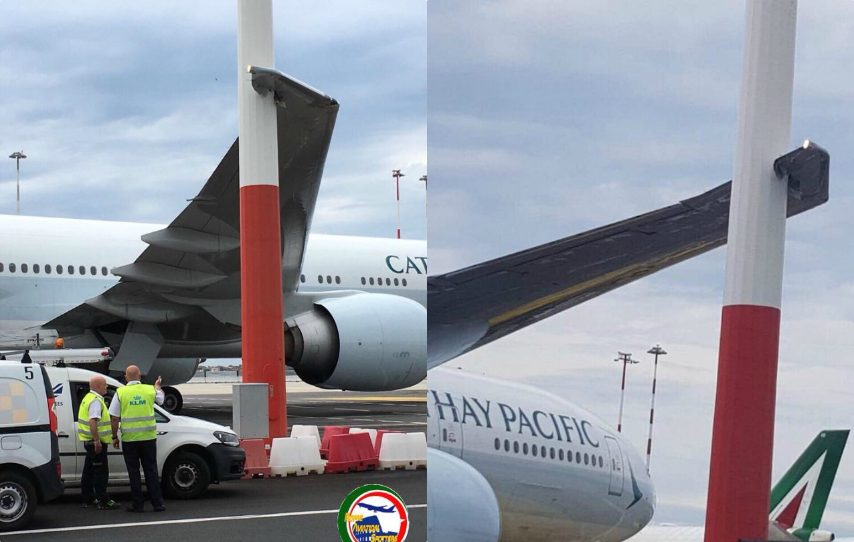 Un aereo della Cathay Pacific è andato a sbattere su un palo della luce ieri mattina all'aeroporto di Fiumicino. Nessun ferito, ma il volo è stato cancellato.