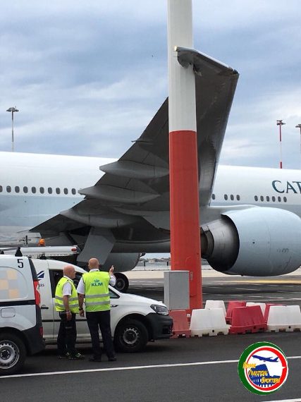 Un aereo della Cathay Pacific è andato a sbattere su un palo della luce ieri mattina all'aeroporto di Fiumicino. Nessun ferito, ma il volo è stato cancellato.