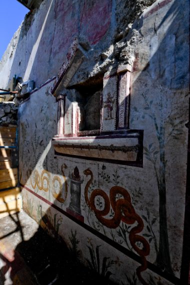 Un sontuoso larario dipinto di circa 4m x 5m riaffiora tra i lapilli in un ambiente ancora in corso di scavo nella Regio V di Pompei, nell’ambito dei lavori di consolidamento dei fronti di scavo, previsti dal Grande progetto Pompei.