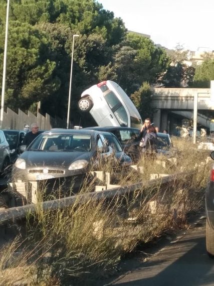 Rocambolesco incidente nel pomeriggio in Via Portuense, quasi all'incrocio con via del Trullo alla periferia ovest di Roma. Sul posto la polizia locale, i vigili del fuoco e il personale sanitario del 118.