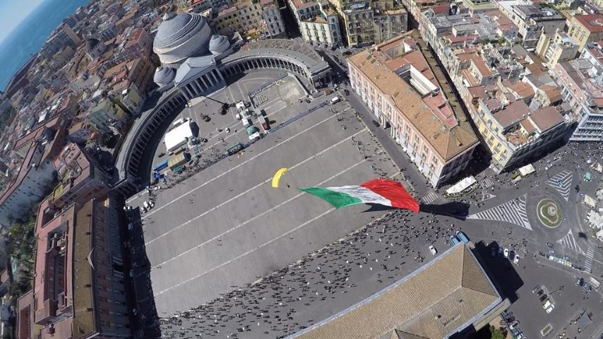 Davvero spettacolare quanto avvenuto nella mattinata di ieri, domenica 24 marzo, in piazza Plebiscito, luogo simbolo di Napoli: paracadutisti dell'Associazione Nazionale Paracadutisti d'Italia si sono lanciati da quattromila metri d'altezza, atterrando in una piccola parte della piazza insieme a una bandiera italiana da record, della grandezza di mille metri quadrati.