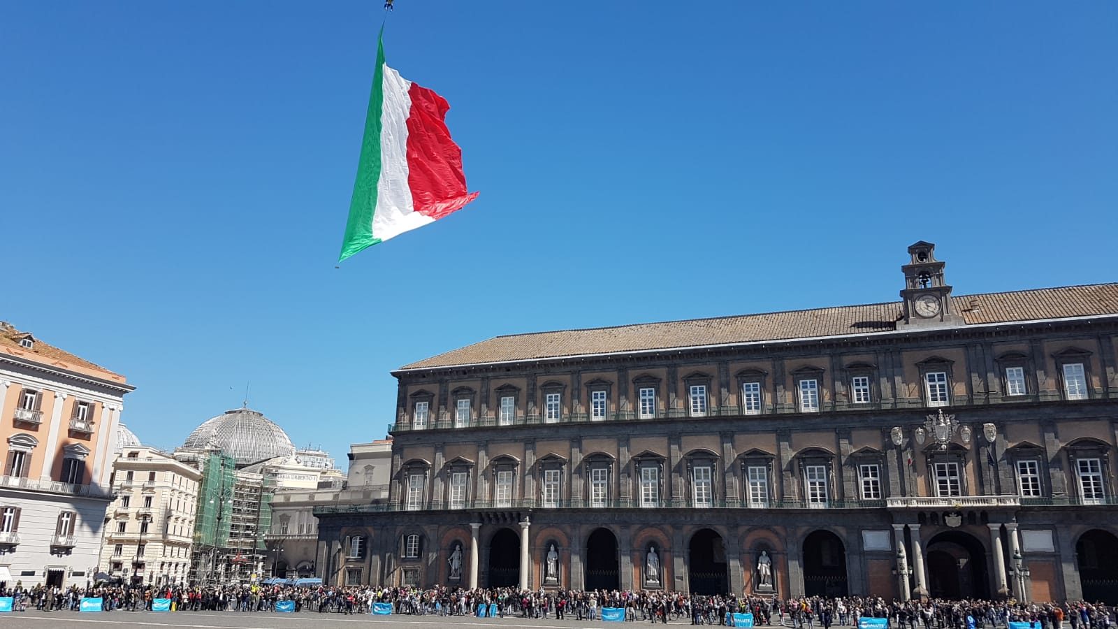 Davvero spettacolare quanto avvenuto nella mattinata di ieri, domenica 24 marzo, in piazza Plebiscito, luogo simbolo di Napoli: paracadutisti dell'Associazione Nazionale Paracadutisti d'Italia si sono lanciati da quattromila metri d'altezza, atterrando in una piccola parte della piazza insieme a una bandiera italiana da record, della grandezza di mille metri quadrati.