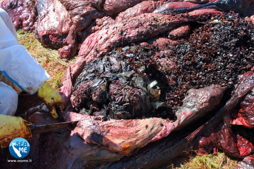 Le immagini choc diffuse dalla onlus Seame Sardinia che mostrano cosa era contenuto nella pancia di una femmina di capodoglio di 8 metri spiaggiata in Sardegna: ben 22 chili di plastica, tra cui piatti, comuni buste per la spesa, grovigli di lenze, sacchi condominiali e anche un feto in decomposizione.