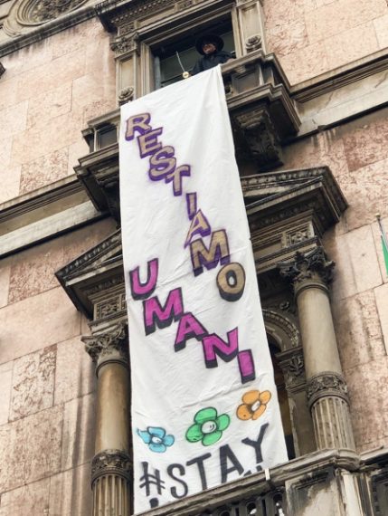 Zorro srotola lo striscione contro Salvini in Piazza Duomo: "Restiamo Umani"