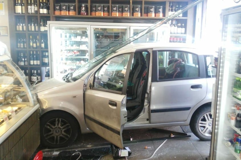 Le incredibili immagini mostrano un'auto, una Fiat Panda, che ha infranto la vetrata del bar Caffè Meet in via Casal del Marmo a Roma, ed è finita all'interno del locale.