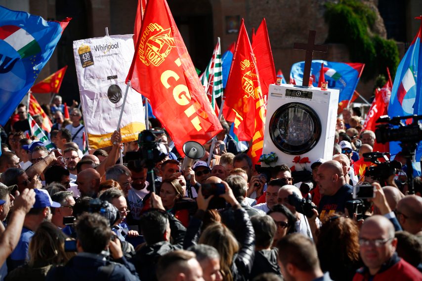 A Roma la protesta  degli operai della fabbrica di lavatrici Whirlpool di Napoli, ai quali si sono uniti anche i colleghi degli altri 7 stabilimenti in Italia, interrompendo così la produzione in tutto il Paese.