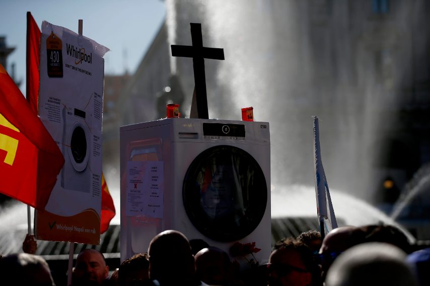 A Roma la protesta  degli operai della fabbrica di lavatrici Whirlpool di Napoli, ai quali si sono uniti anche i colleghi degli altri 7 stabilimenti in Italia, interrompendo così la produzione in tutto il Paese.