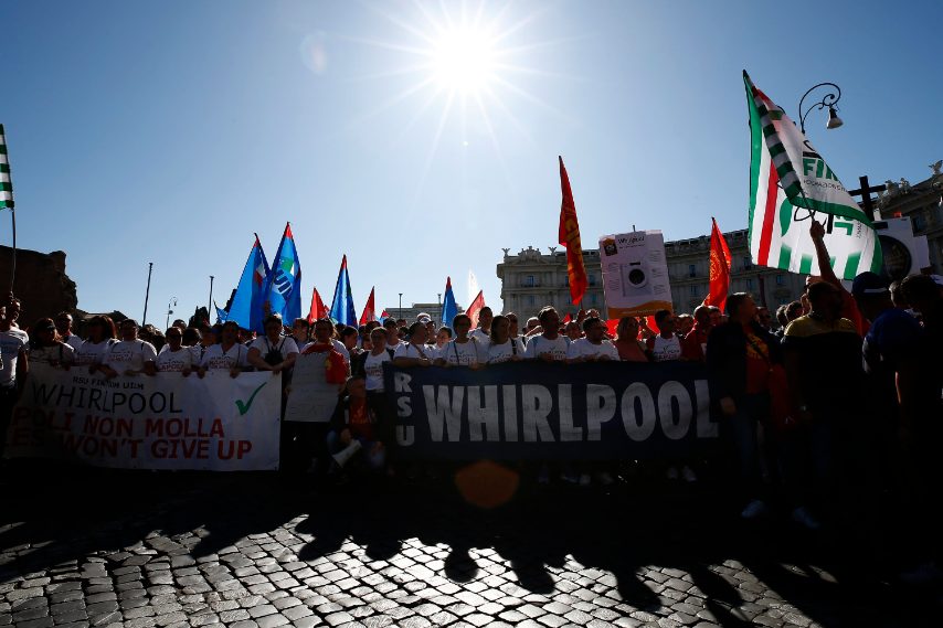 A Roma la protesta  degli operai della fabbrica di lavatrici Whirlpool di Napoli, ai quali si sono uniti anche i colleghi degli altri 7 stabilimenti in Italia, interrompendo così la produzione in tutto il Paese.