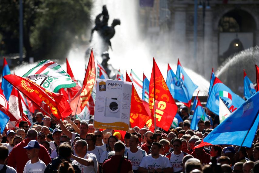 A Roma la protesta  degli operai della fabbrica di lavatrici Whirlpool di Napoli, ai quali si sono uniti anche i colleghi degli altri 7 stabilimenti in Italia, interrompendo così la produzione in tutto il Paese.