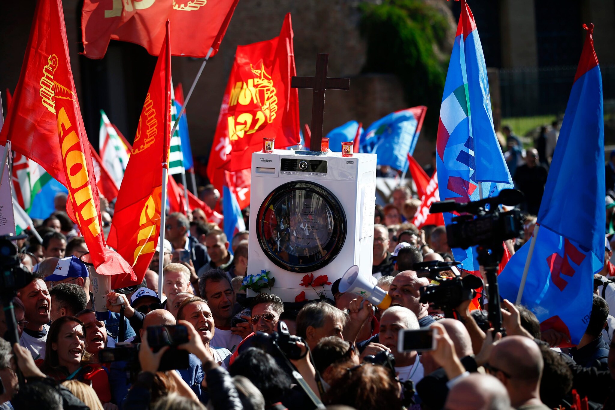 A Roma la protesta  degli operai della fabbrica di lavatrici Whirlpool di Napoli, ai quali si sono uniti anche i colleghi degli altri 7 stabilimenti in Italia, interrompendo così la produzione in tutto il Paese.