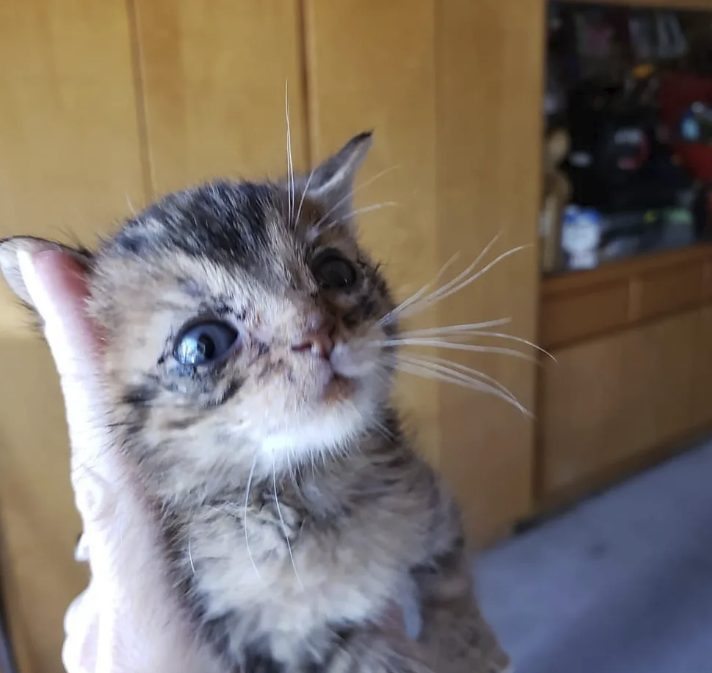 Questo gattino, delle dimensioni di un palmo della mano, è stato salvato in strada a Carson City, in California dal gruppo di salvataggio Wrenn Rescues. Erin e suo figlio Chris, che fanno parte del gruppo, lo hanno adottato: il gattino è solito arrampicarsi sulle spalle  del bambino di 11 anni e sembra starci proprio bene; per di più in casa c'è anche un alro fatto, oreo, che si prende cura del cucciolo.