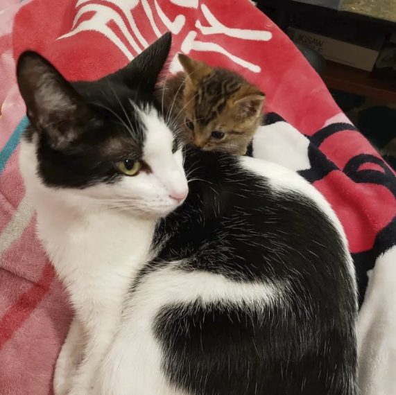 Questo gattino, delle dimensioni di un palmo della mano, è stato salvato in strada a Carson City, in California dal gruppo di salvataggio Wrenn Rescues. Erin e suo figlio Chris, che fanno parte del gruppo, lo hanno adottato: il gattino è solito arrampicarsi sulle spalle  del bambino di 11 anni e sembra starci proprio bene; per di più in casa c'è anche un alro fatto, oreo, che si prende cura del cucciolo.