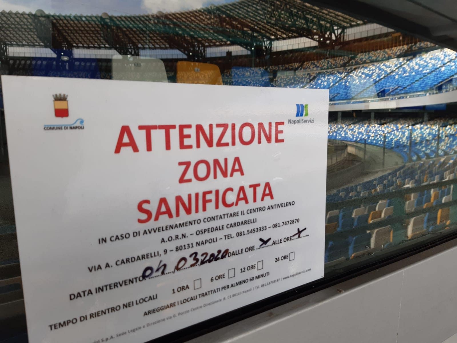 Gli addetti specializzati della NapoliServizi sono intervenuti questa mattina per sanificare lo stadio di Fuorigrotta. Utilizzati anche dei camioncini con atomizzatori per nebulizzare i detergenti sulle superfici più grandi.