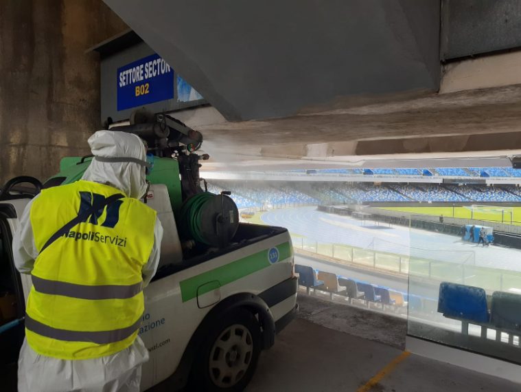 Gli addetti specializzati della NapoliServizi sono intervenuti questa mattina per sanificare lo stadio di Fuorigrotta. Utilizzati anche dei camioncini con atomizzatori per nebulizzare i detergenti sulle superfici più grandi.