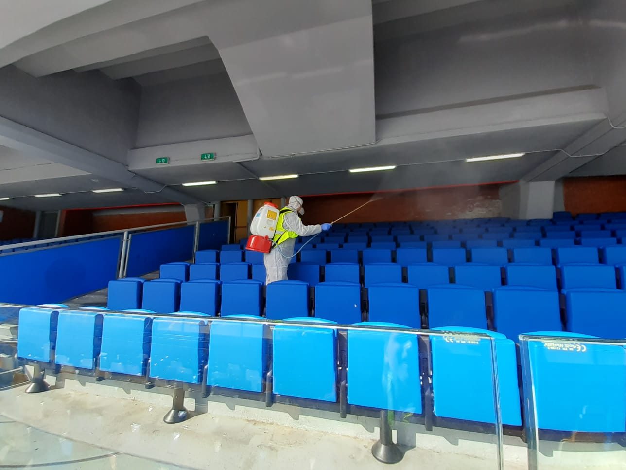 Gli addetti specializzati della NapoliServizi sono intervenuti questa mattina per sanificare lo stadio di Fuorigrotta. Utilizzati anche dei camioncini con atomizzatori per nebulizzare i detergenti sulle superfici più grandi.