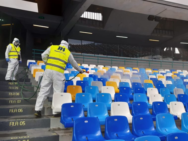 Gli addetti specializzati della NapoliServizi sono intervenuti questa mattina per sanificare lo stadio di Fuorigrotta. Utilizzati anche dei camioncini con atomizzatori per nebulizzare i detergenti sulle superfici più grandi.
