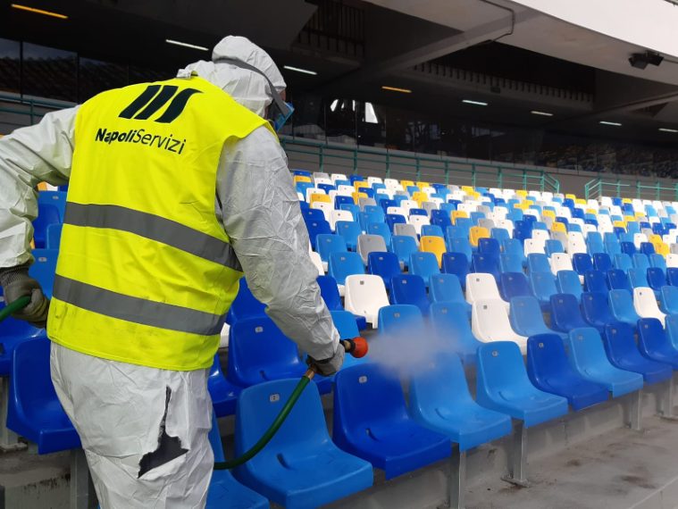Gli addetti specializzati della NapoliServizi sono intervenuti questa mattina per sanificare lo stadio di Fuorigrotta. Utilizzati anche dei camioncini con atomizzatori per nebulizzare i detergenti sulle superfici più grandi.