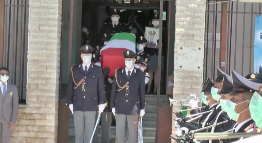 A Secondigliano l'ultimo saluto all'agente scelto Pasquale Apicella, poliziotto del commissariato di Secondigliano, morto a Napoli il 27 aprile scorso, quando l'auto di una banda di criminali in fuga si è schiantata contro la sua volante.
