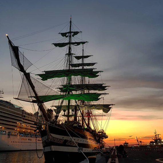 Le suggestive immagini mostrano il veliero Amerigo Vespucci illuminato del tricolore italiano. La nave scuola della Marina Militare è entrata stamattina 13 luglio 2020 nel porto di Civitavecchia.
