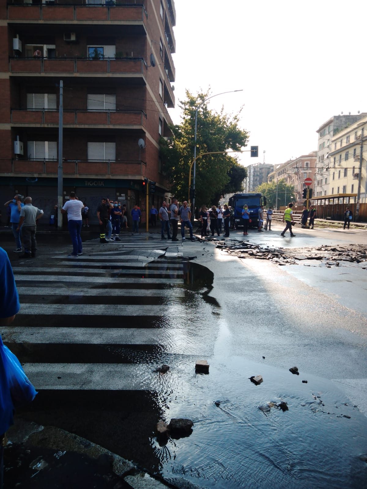 Grossa rottura di una tubatura Acea in piazza della Marranella, all'incrocio tra via Casilina, via dell'Acqua Bullicante e via di Torpignattara.