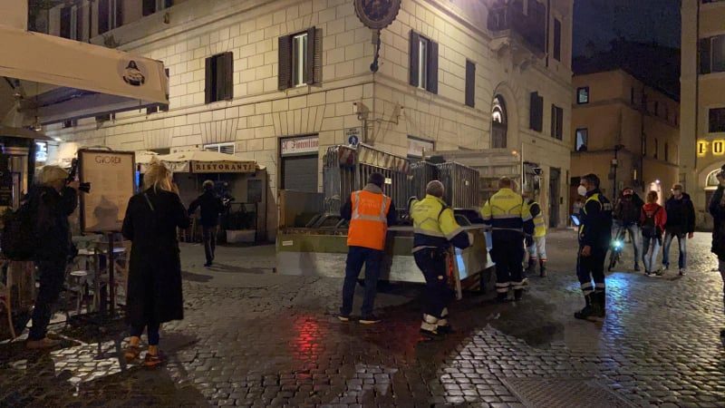 Venerdì 23 ottobre i commercianti di piazza Campo de' Fiori hanno protestato contro l'ordinanza della Regione Lazio che impone il coprifuoco dalle ore 24 alle 5 del giorno seguente, chiudendo in anticipo i locali. Le piazze della Capitale sono deserte.