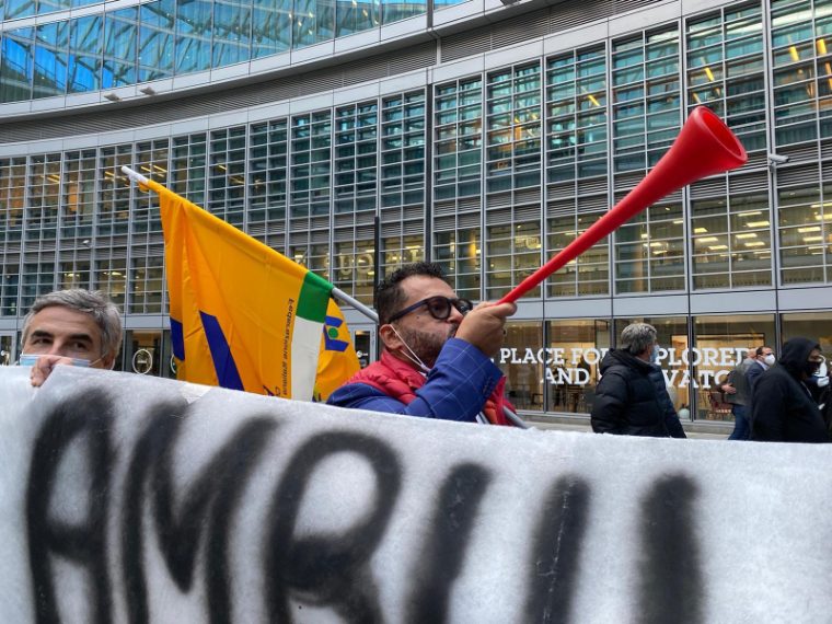 Circa cento ambulanti hanno protestato oggi davanti alla sede di Regione Lombardia per chiedere aiuti economici per affrontare le nuove misure anti covid.