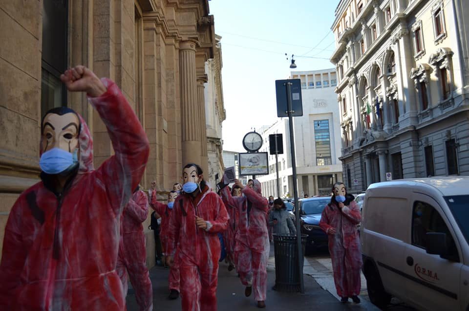 Come una scena della serie tv "La casa di Carta". Il flash mob degli attivisti del centro sociale Cantiere a Milano, fuori dalla Banca d'Italia di piazza Cordusio, con maschere di Dalì, e banconote da 100 euro sventolate al grido "senza soldi non si mangia".