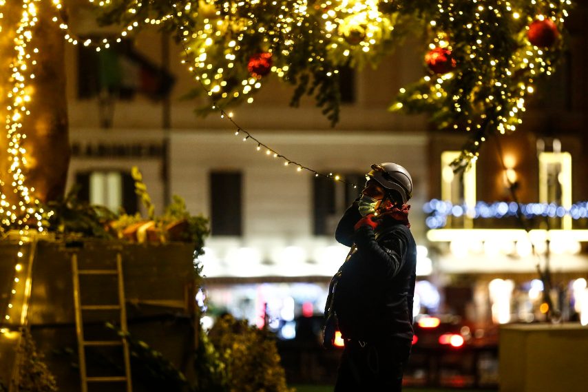 Prove di accensione dell'albero di Natale in Piazza Venezia a Roma. Operai al lavoro per far sì che la città si illumini della magia del Natale.