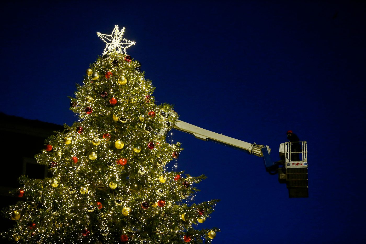 Prove di accensione dell'albero di Natale in Piazza Venezia a Roma. Operai al lavoro per far sì che la città si illumini della magia del Natale.