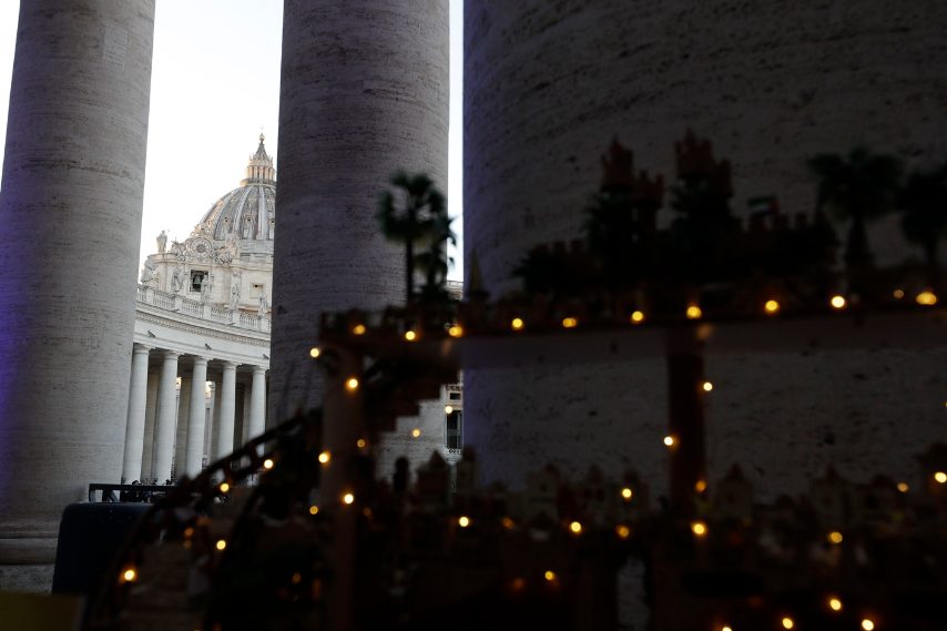 Presepi all'aperto tra le colonne di Piazza San Pietro