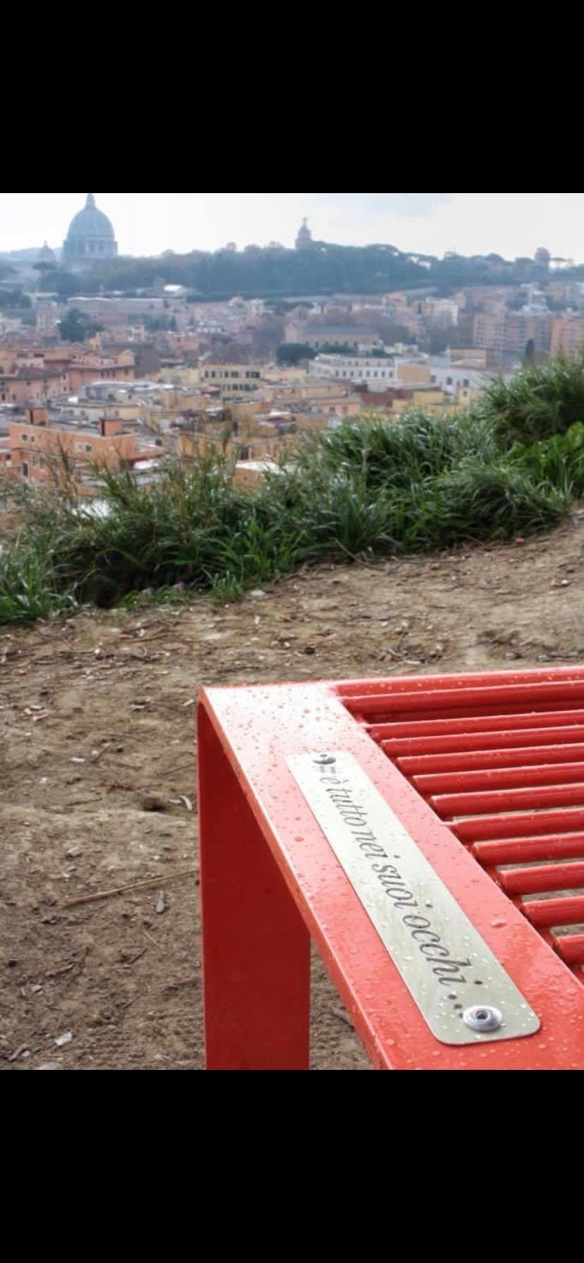 Una panchina rosso corallo in Piazzale Socrate a Roma, alla Balduina. L'installazione è di un designer anonimo ed è stata ritrovata qui insieme a un biglietto in cui se ne spiegano le origini. L'amore per una ragazza e poi la delusione: la panchina è dove sedersi per aspettare la persona amata mentre si contempla l'orizzonte. L'opera si intitola 'Panchina con vista' ed è stata realizzata anche per dire no alla violenza di genere