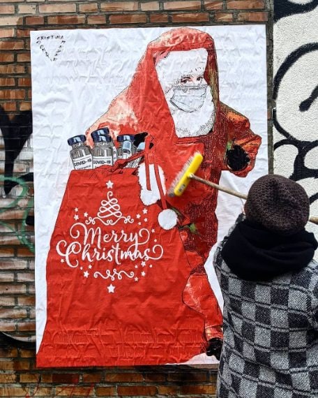 Non i soliti doni nel sacco di Babbo Natale, ma tante dosi di vaccino anticovid. Questo il Babbo Natale di quest'anno secondo Cristina Donati Meyer, autrice di questo disegno visibile in via Valenza a Milano. Questa la didascalia che la stessa @cdonatimeyer ha lasciato su Instagram: "Le case farmaceutiche hanno ricevuto miliardi di fondi pubblici per accelerare le sperimentazioni finalizzate alla produzione del vaccino anti #Covid .