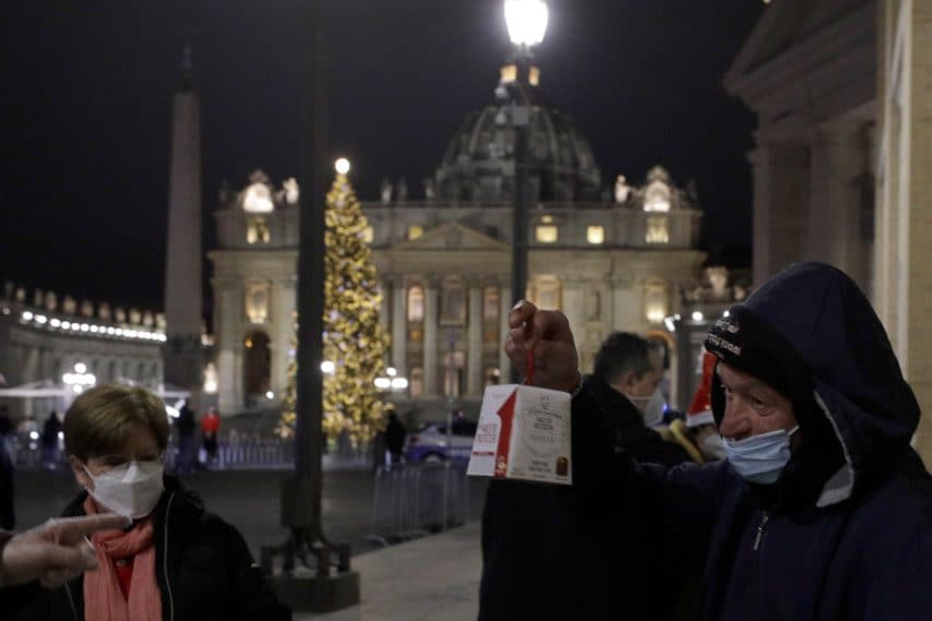 I volontari della Comunità di Sant'Egidio distribuiscono cibo e doni ai senzatetto fuori da Piazza San Pietro,