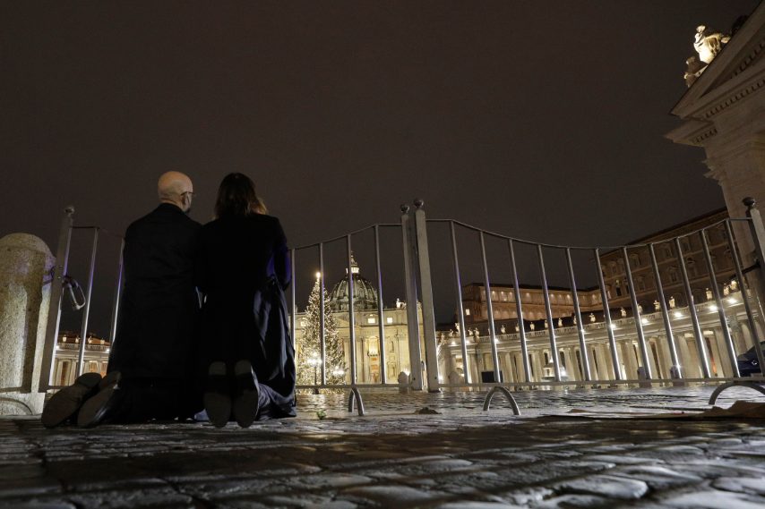 I volontari della Comunità di Sant'Egidio distribuiscono cibo e doni ai senzatetto fuori da Piazza San Pietro,