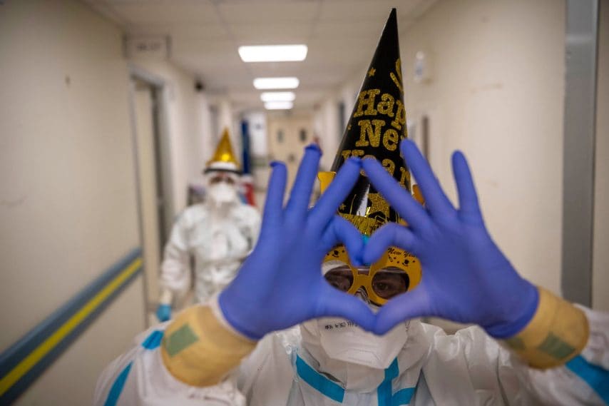 Il personale del reparto di terapia intensiva dell'ospedale San Filippo Neri saluta l'arrivo del 2021.