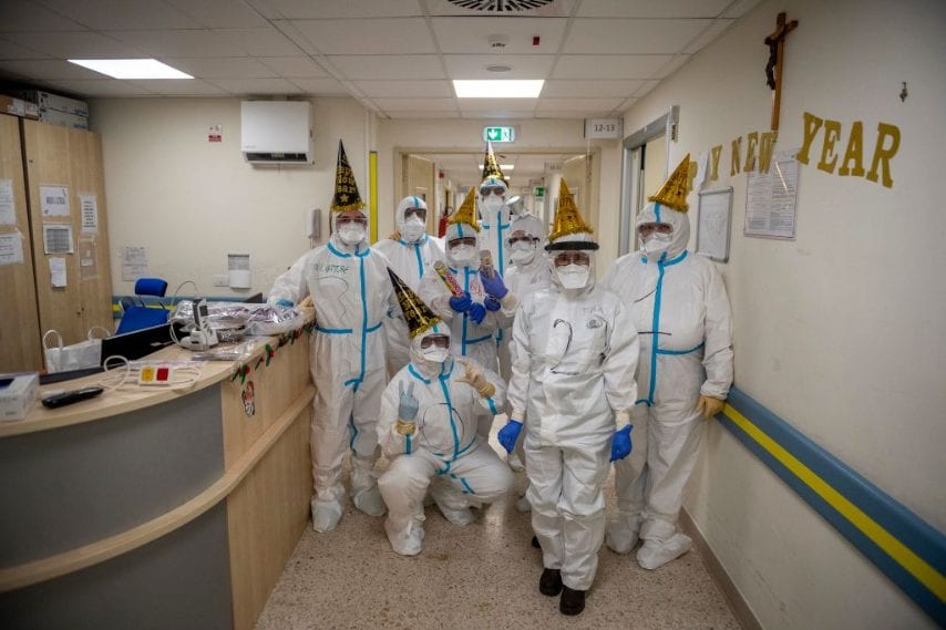 Il personale del reparto di terapia intensiva dell'ospedale San Filippo Neri saluta l'arrivo del 2021.